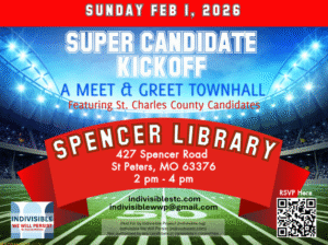Indivisible We Will Persist is hosting the 2026 Super Candidate Kickoff – Meet and Greet with candidates and constituents throughout St. Charles County. At this cross-partisan event, constituents will be hearing from candidates that be appearing on the August and November 2026 ballots, or spokespeople that are members of the St. Charles community (if a candidate is not available).