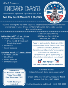 NEMO is reviving the old Demo Days — a celebration of Democracy, the never-ending need of Labor Unions for Working People & Democratic Leaders. Now more than ever!