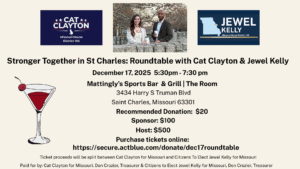 Stronger Together in St. Charles: Roundtable with Cat Clayton & Jewel Kelly + Add to Google Calendar + iCal / Outlook export Date Dec 17 2025 Expired! Time 5:30 pm – 7:30 pm Location The Room at Mattingly’s 3434 Harry S. Truman Boulevard, Saint Charles, Missouri 63301 Category Candidate Events Special Events Share this event